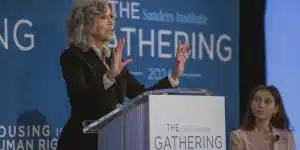 Actor and activist Jane Fonda and community organizer Nalleli Cobo speak to the audience at The Gathering. (Photo: © Bryan Giardinelli / The Sanders Institute)