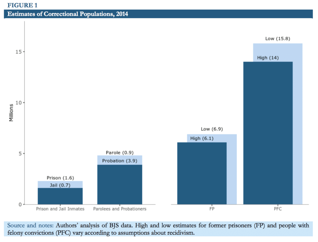 Despite modest declines in recent years, the large and decades-long blossoming of the prison population ensure that it will take many years before the United States sees a corresponding decrease in the number of former prisoners. Using data from the Bureau of Justice Statistics (BJS), this report estimates that there were between 14 and 15.8 million working-age people with felony convictions in 2014, of whom between 6.1 and 6.9 million were former prisoners.
