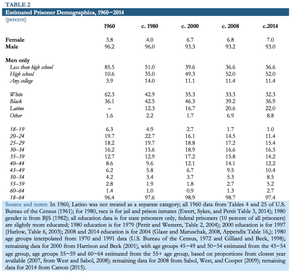 In addition to estimates of the number of former prisoners and people with felony convictions, another goal of this paper is to determine their demographic characteristics. To estimate these characteristics, this report first uses the demographic characteristics of current prisoners for selected years and applies these estimates to the population of former prisoners and people with felony convictions. Table 2 shows various characteristics of the prisoner population for selected years from 1960 to 2014. For all years, the male prisoner population greatly outnumbered the female prisoner population, with men making up at least 93 percent of the population in all years displayed. In 2014, men made up 93.0 percent of the prison population, and this percentage has remained mostly steady since 2000.