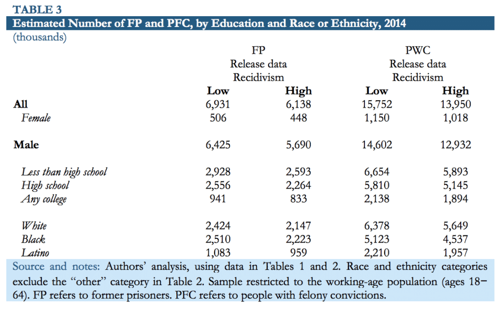 Using the data from Table 2 on the prisoner population, estimates of the demographic characteristics of the entire population of former prisoners and people with felony convictions were created, adjusting for racial differences in recidivism rates and imprisonment rates conditional on felony conviction. Table 3 displays these estimates. According to this data, in 2014 between 448,000 and 506,000 former prisoners were women, and between 1.0 and 1.2 million people with felony convictions were women. Between 5.7 and 6.4 million former prisoners were men, and between 12.9 and 14.6 million people with felony convictions were men. Among male former prisoners, between 2.6 and 2.9 million had less than a high school degree.