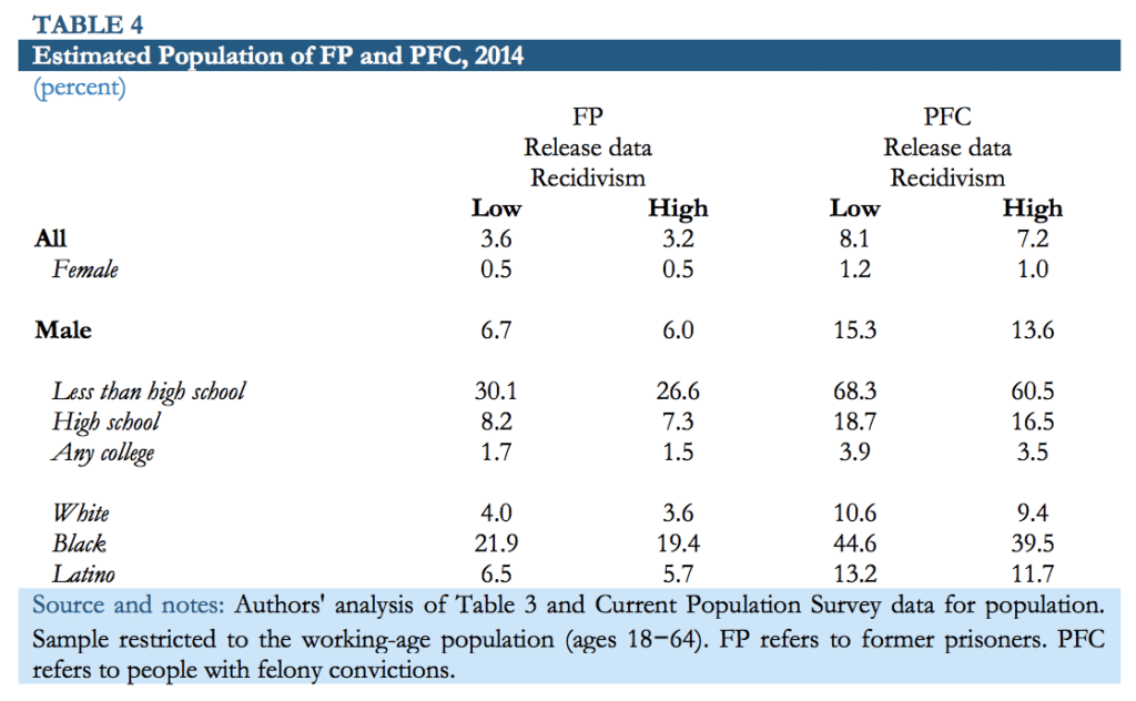 - Between 6.0 and 6.7 percent of the male working-age population were former prisoners, while between 13.6 and 15.3 percent were people with felony convictions.
