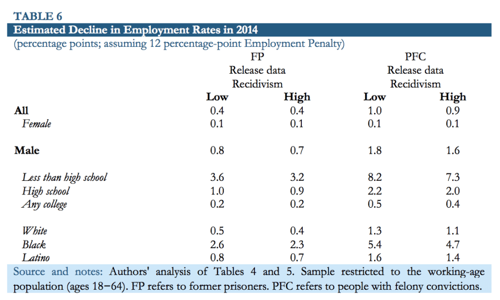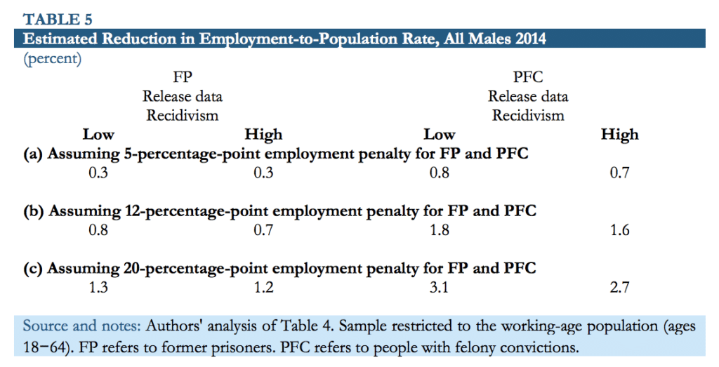 “In the low-effects scenario, we assume that ex-prisoners or ex-felons pay an employment penalty of five percentage points (roughly consistent with the largest effects estimated using administrative data and the lower range of effects estimated using the aggregate data and survey data). In the mediumeffects scenario, we assume that the employment penalty faced by ex-prisoners and ex-felons is 12 percentage points, which is consistent with the bulk of the survey-based studies. In the high-effects scenario, we assume that the employment penalty is 20 percentage points, which is consistent with the largest effects estimated in the survey-based studies, as well as, arguably, the findings of the employer surveys and audit studies.”