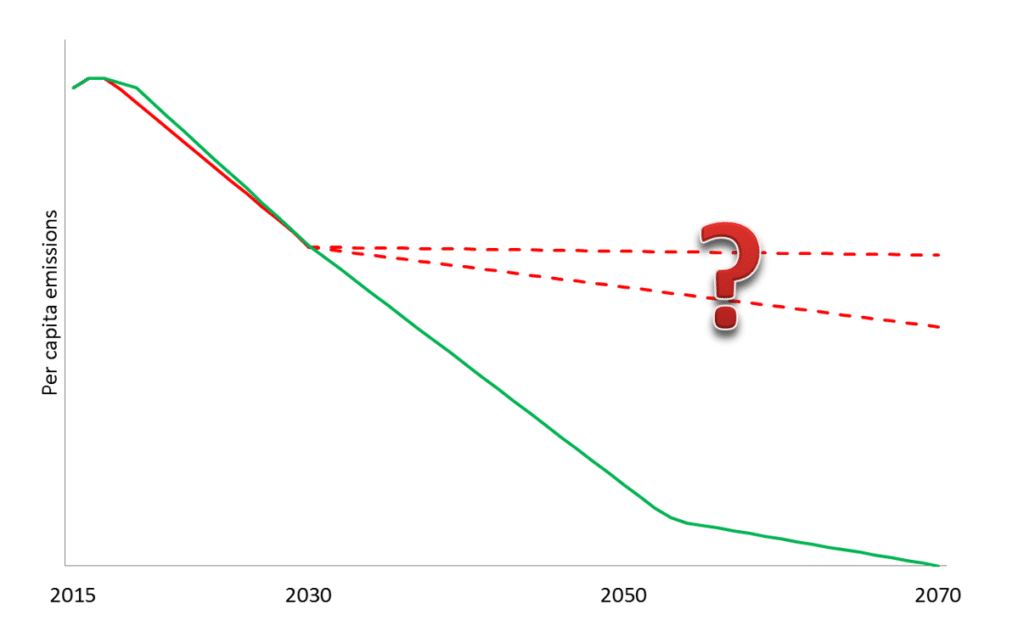 The figure above illustrates the conundrum. The low-hanging-fruit pathway (red) achieves a steep reduction by 2030. It probably does so at lower cost than the deep-decarbonization pathway (green), because the conversion to zero-carbon electricity (for example, wind and solar power) and to electric vehicles might be more costly than a simple patch-up of our current technologies. The problem is that the low-hanging-fruit pathway will achieve fewer reductions after 2030. It will lead into a dead end. Only the deep-decarbonization pathway gets the economy to the necessary stage of decarbonization by 2050 and to zero net emissions by 2070.