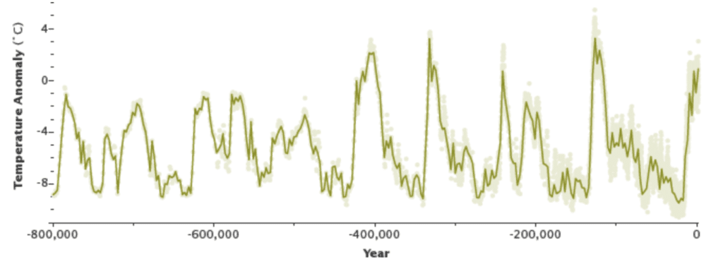 Earth has cycled between ice ages (low points, large negative anomalies) and warm interglacials (peaks). (NASA graph by Robert Simmon, based on data from Jouzel et al., 2007.)