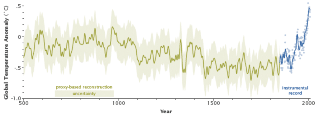 Temperature histories from paleoclimate data (green line) compared to the history based on modern instruments (blue line) suggest that global temperature is warmer now than it has been in the past 1,000 years, and possibly longer. (Graph adapted from Mann et al., 2008.)