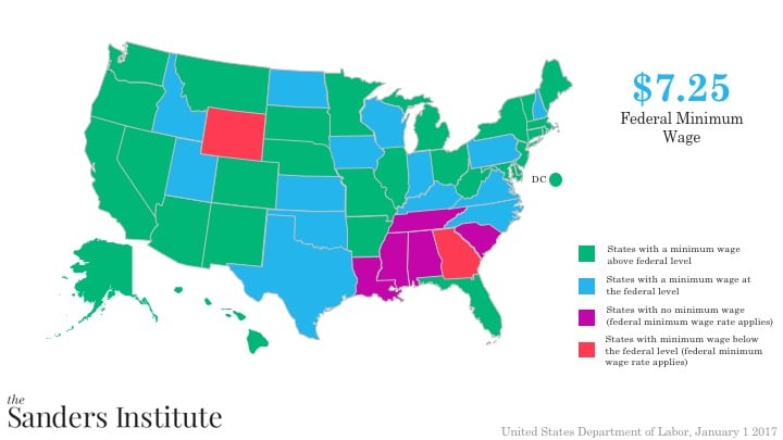 While the Federal minimum wage is $7.25, different state governments have different laws regulating the minimum wage within that state. The map below from the Department of Labor shows which states have minimum wage laws above the federal level, at the federal level, no minimum wage laws, or minimum wage laws below the federal level.