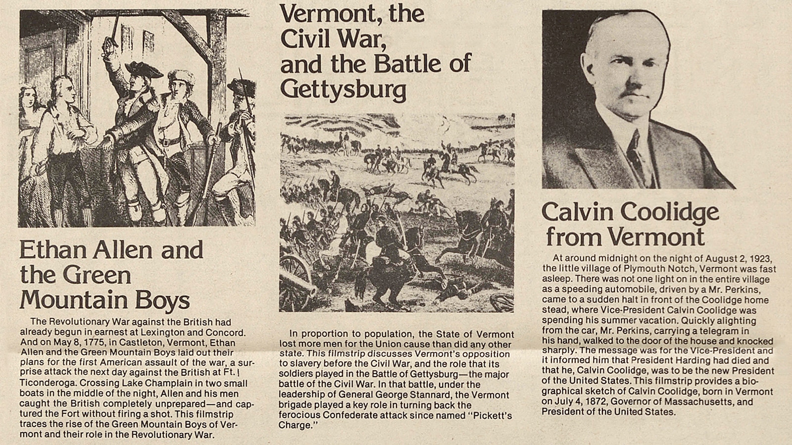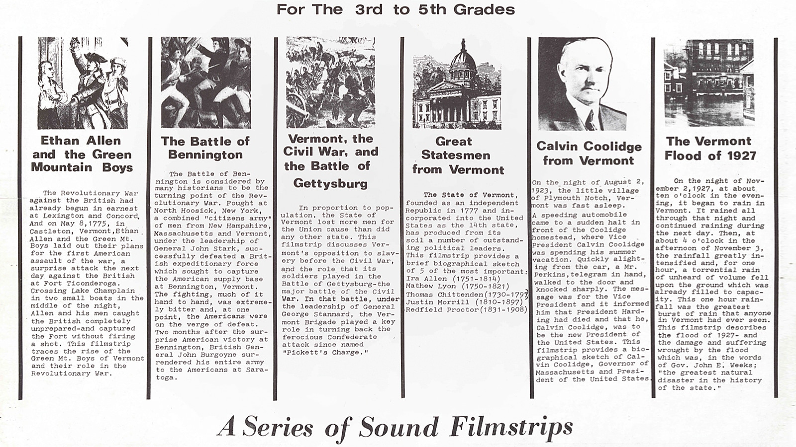 The educational organization produced filmstrips focused on historical and political issues that would address the needs of New England educators. Sanders explained, “It is our belief that state and regional history has too long been neglected by the audio-visual industry, and we are happy to begin the process of rectifying that situation. We believe that students have the right to learn about the state and region in which they are living.”[1]