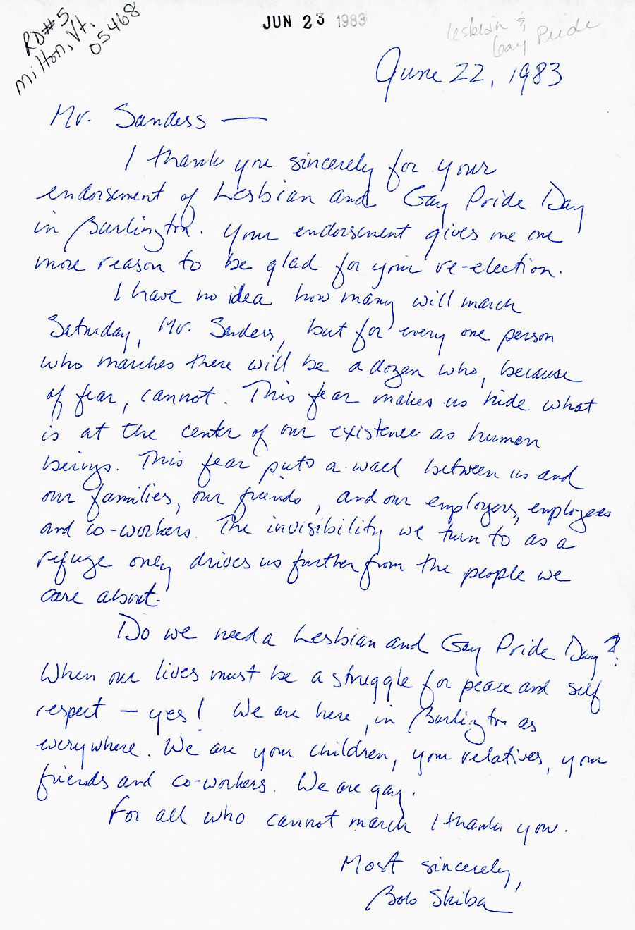 “I thank you sincerely for your endorsement of Lesbian and Gay Pride Day in Burlington. Your endorsement gives me more reason to be glad for your re-election. (For every person who marched in the parade), there will be a dozen who, because of fear, cannot.” Such fears, he said, “make us hide what is at the center of our existence as human beings.”