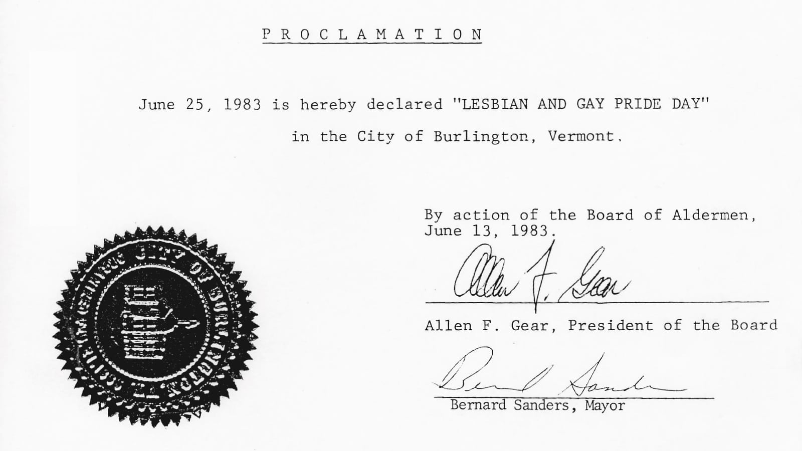 Mayor Bernie Sanders issued a proclamation declaring June 25, 1983 as Burlington’s Lesbian and Gay Pride today, and supported the city’s first-ever pride march. Gay rights organizers had originally called on the Board of Alderman for support. The University of Vermont Library of Special Collections documented the highly contested battle that ensued.