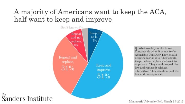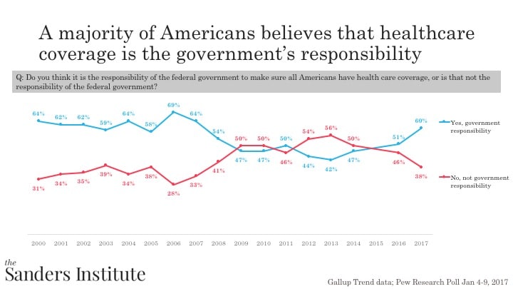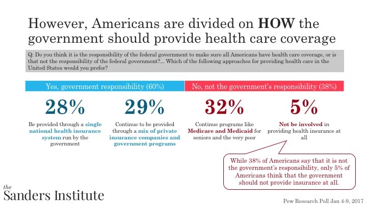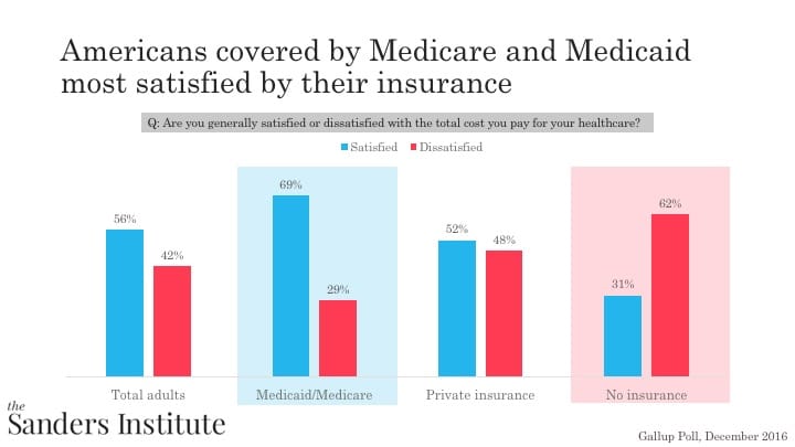 Alternatively, the US could expand and improve the current program that puts clinicians in charge, is popular, and works at controlling costs: Medicare. With administrative costs as low as 5–6% compared to the 13% or higher for private insurance, Medicare is more efficient. The growth in Medicare spending, around 2.4% annually, is much less than growth in overall healthcare spending and far less than recent premium increases. Under Improved Medicare for All, benefits would be expanded to include those that ACA, Medicaid and CHIP provide, and Medicare will negotiate prescription drug prices. The biggest shortfalls in Medicare, the escalating privatization pushed by the insurance-financed politicians that have resulted in higher out of pocket costs for seniors, over payments to the private Medicare Advantage plans and the “donut hole” in the private the prescription drug benefit, would be eliminated through a robust Medicare for all plan, such as proposed nationally in Sen. Bernie Sanders S 1804 bill or the California single payer bill SB 562.