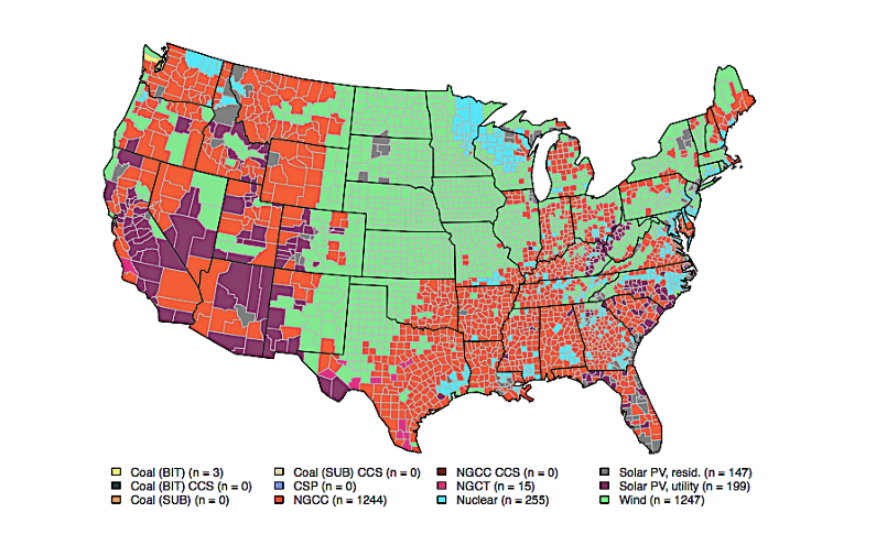 A new tool from the Energy Institute of the University of Texas shows the cheapest kind of new power plant by county, accounting for land available to deploy a particular technology. (For instance, the site notes, “it is not likely that one could build a power plant in a national park.”) The map below shows which technologies are most cost-effective without subsidies.