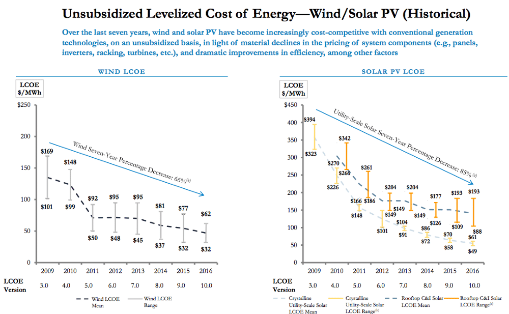 The Lazard report is just the latest chapter in the success story of renewable energy. Since 2009, the cost of solar has been cut nearly in half. The cost of wind has fallen by two-thirds. The precipitous drop in price is reminiscent of shrinking costs for personal computers. Wind and, particularly solar, have yet to level off. New technologies and cheaper materials will continue to drive down costs in the years ahead.