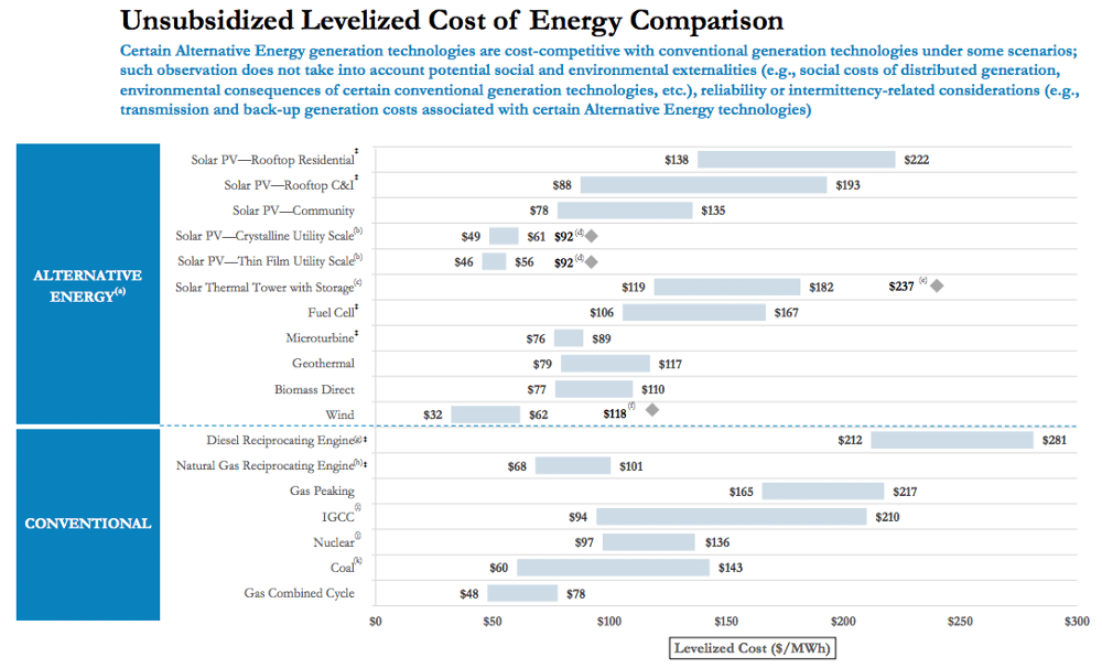 The chart below shows the total cost per megawatt-hour of different forms of power. Lazard added up the lifetime cost of parts, fuel, labor, and other expenses and divided by the number of megawatt-hours generated. From this, they produced a range for the levelized cost of energy (LCOE).