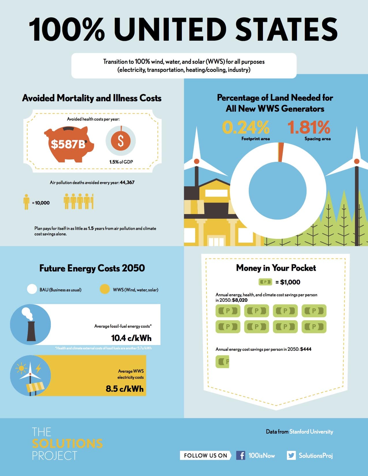One person who noticed the falling prices and improving technology early on was Mark Jacobson, director of Stanford University’s Atmosphere and Energy Program. In 2009, his team published a series of plans showing how the United States could generate all its energy from the sun, the wind and the falling water that produces hydropower. Two years later, Jacobson and a crew of co-conspirators—including actor Mark Ruffalo—launched the Solutions Project to move the idea out of academic journals and into the real world. The group has since published detailed plans for most of the planet’s countries. If you want to know how many acres of south-facing roof you can find in Alabama or how much wind blows across Zimbabwe, these are the folks to ask.